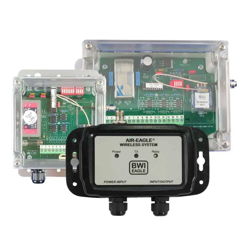 Air-Eagle SR Plus Contact Input Transmitters by BWI Eagle remotely control equipment using an external relay or switch inputs. Single or multi-channel industrial wireless remote control units can operate one or more receivers up to 600 feet. Contact input transmitters include a terminal strip that accepts one, four, eight or 20 dry contact inputs from any external relay or switch.